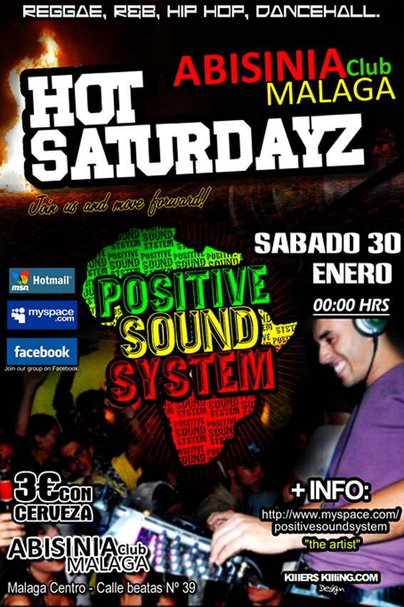 Hot Saturdayz con Positive Sound System en Abisinia Club, c/ Beatas 39. Málaga centro. 00:00/4:00. Entrada 3€ con cerveza.