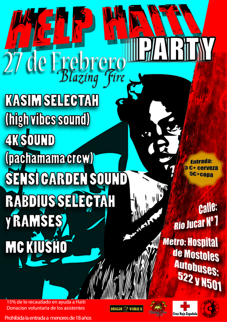 Fiesta benéfica para recaudar fondos para Haití en el Blazing Fire (c/ Rio Jucar 7, Móstoles) con:Kassi Selektah (High Vibes Sound), 4K Sound (Pachamama Crew), Sensi Garden Sound, Rabdius Selektah, Ramses y Mc Kiusho.