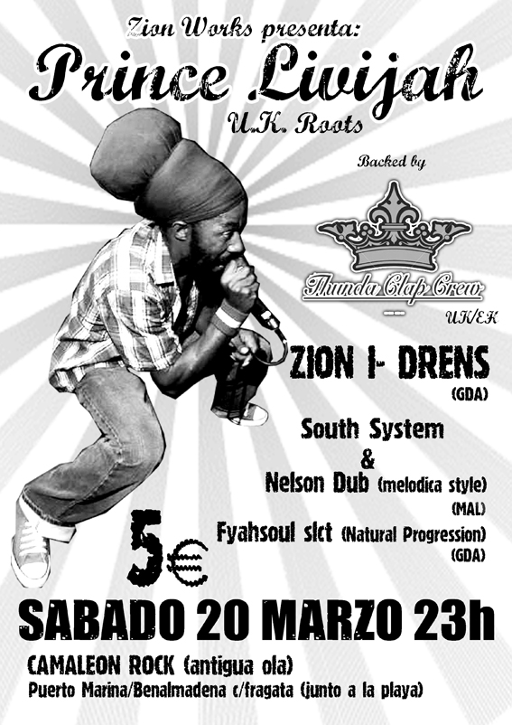 «Zion Works, colectivo que representa la labor del afincado en Granada, Zion Idrens, presenta una velada llena de Roots Reggae en la sala Camaleon Rock (antigua ola) de Benalmadena , Malaga. Para tal ocasión estara como invitado principal Livijah, artista preocedente de la vieja escuela inglesa miembro del prestigioso sound Jah Youth y que trabaja usualmente con sellos ingleses como Gussie P, Tigerman o Relity Shock Records. Acompañado a Livijah podremos disfrutar del sound Thunda Clap, que viene cargado desde inglaterra con su maleta de discos llena de joyas. Para completar la noche estaran a los platos , los propios Zion Idrens y South Sytem que estaran acompañados por Nelson ( reggae band) a la melódica. A su vez será una noche llena de sorpresas y las máximas y elevadas positivas vibraciones.»