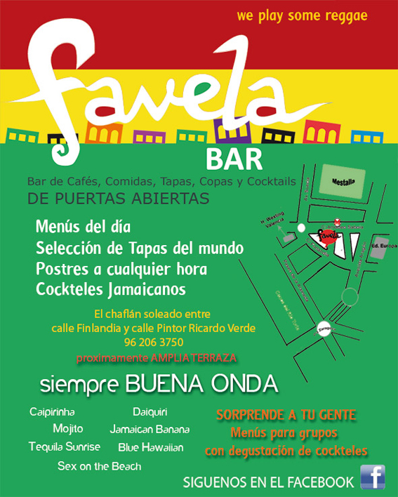 «Os invitamos a pasar por el Favela Bar en la calle Pintor Ricardo Verde, nº1 de Valencia (Cerca del Mestalla, Avda. Aragòn). Ven con el Flyer adjunto impreso y te invitamos a un Rasta Shot, un delicioso chupito formado con los colores de la bandera Rasta. (Promoción valida hasta final de Abril).»