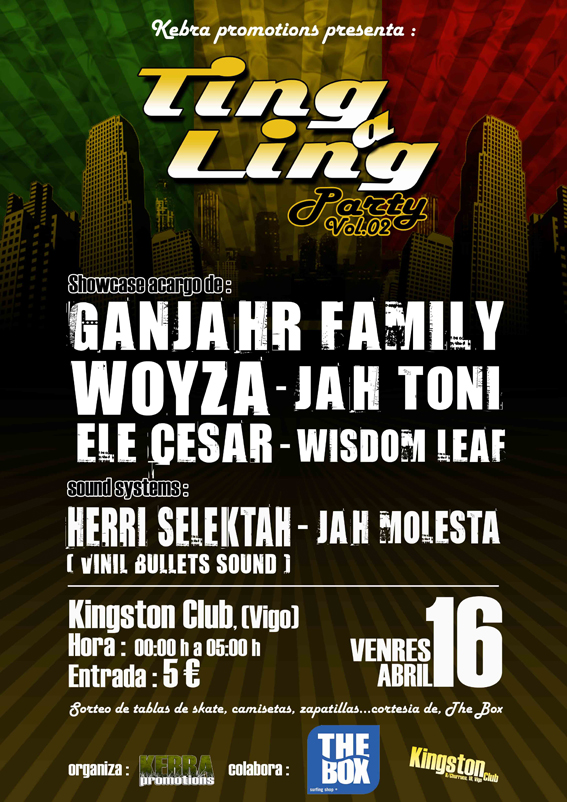«Tras la buena acogida por parte del público cosechada en su presentación, Kebra Promotions se enorgullece en presentar: Ting A Ling Party Vol. 2. Una noche repleta de sonidos Reggae, Hip Hop y Soul que harán vibrar los cimientos del Kingston Club, estandarte de la música negra en Vigo.»