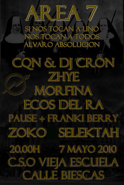 El Viernes 7 Mayo a partir de las 20:00 en el C.S.O. La Vieja Escuela (C/ Biescas S/N, Zaragoza) actuarán Cqn & Dj Cron + Zhye, Morfina, Ecos del Ra + Pause + Franky Berry. Tras los conciertos, selección del mejor reggae de la mano de Zoko Selektah.
