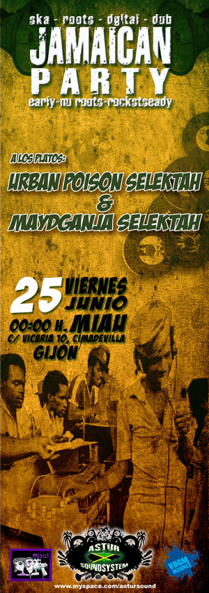 «La Asociación cultural tiene el placer de informar de que el próximo Viernes 25 de Junio se celebrará la fiesta Jamaican Party en el Pub Miau (c/ Vicaría 10, Cimadevilla, Gijón), donde se recorreran los sonidos ska, roots, early reggae, digital, dub, rocksteady y nu roots.