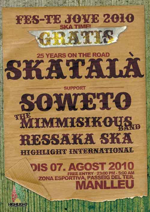 El próximo 7 de Agosto, dentro de las fiestas de la localidad catalana de Manlleu, tendrá lugar un concierto en el que los veteranos Skatalà serán los protagonistas acompañados por grupos como Soweto, The Mimmisikous Band, y .