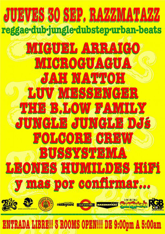 El Jueves 30 de Septiembre a partir de las 21:00 y hasta las 5:00 actuarán en la sala de Barcelona Miguel Arraigo, Microguagua, , Jah Nattoh, Leones Humildes, The Blow Family, Folcore Crew, Bussystema, Jungle Jungle dj´s, 23hz & Numaestro, Mr Gasparov, Ikkaku, Fx & Satta B y Dj Tuffist entre muchos otros aun por confirmar.
