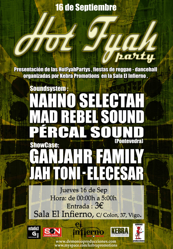 El 16 de Septiembre, fiesta presentacion Hot Fyah Partys, con Nahno Selectah, Mad Rebel Sound, Pércal Sound, Ganjahr Family, Jah Toni y Elecesar.