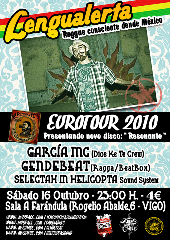 «Lengualerta traerá hasta la Sala A Farándula de Vigo este 16 de Octubre a las 23:00 la presentación de su último disco «Resonante»; como parte de su gira europea. El reggae consciente de México estará acompañado por GarciaMc del colectivo DiosketeCrew y Gendbeat (ragga y beatbox de Galiza) sonorizado por el sistema de sonido Selectah in Helicopta.