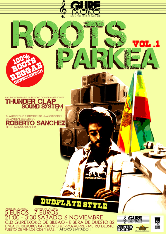 «En Roots Parkea tendremos a la combinacion por primera vez de Roberto al micrófono en Thunder Clap Sound System, y ofreciendo una seleccion de material inedita y exclusiva. Será una noche de extra sub grave y una seleccion de roots reggae de todas épocas que no defraudará para hacer temblar el Guretxoko, una pista de skate cubierto en Deusto, Bilbao.»