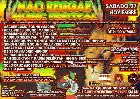 El sábado 27 de Noviembre tendrá lugar en Toledo el Nao Reggae Music Festival con las actuaciones de , , Dhamiano Selektah, Rabdius Selektah, Bajo Zero, Sound, Lasai Man, Dj Sebo, Yerbabuena Crew, Rah Selektah y Kasim Selektah, Dj Sion, Solo Cruz y Alex B.