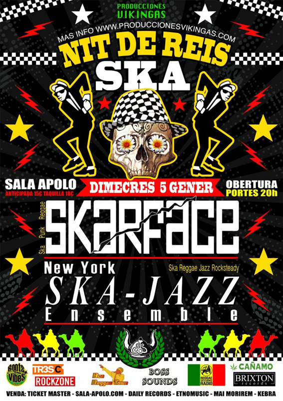 «Producciones Vikingas se complace en presentar a dos de los máximos exponentes de la música ska, jazz y reggae: New York Ska-Jazz Ensemble y Skarface.»