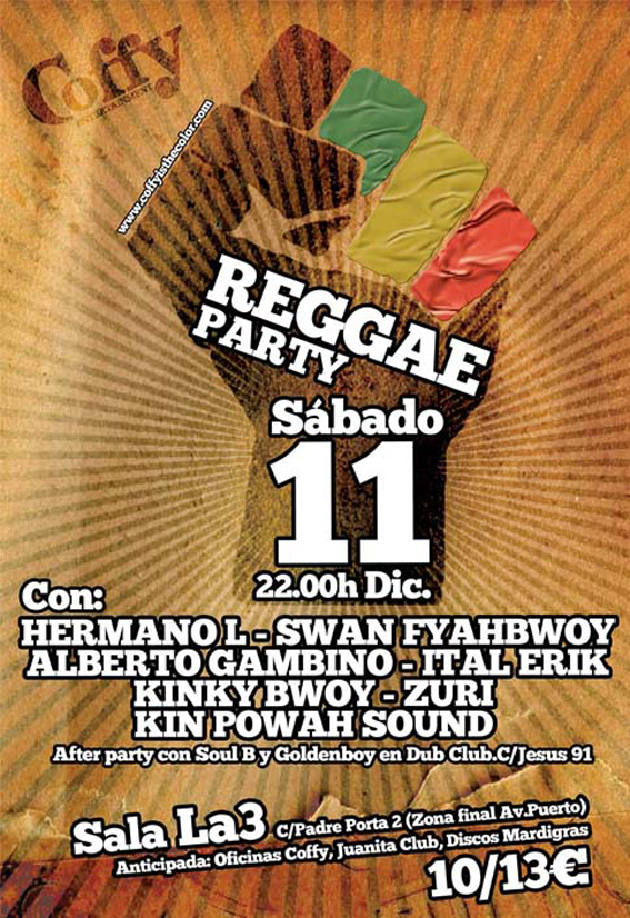 «Las entradas costarán 10€ anticipadas y 13€ en taquilla y se podrán adquirir en las oficinas de Coffy Entertainment (C/ de las Cocinas, 4), en Discos Mardi Gras (C/ de las Mantas, 2) y en Juanita Club (C/ Lepanto, 8). No hay excusas para no acudir a resguardarse del frío y a volverse locos con los showcase de monstruos como Hermano L, Swan Fyahbwoy, , Ital Erik, o Zuri