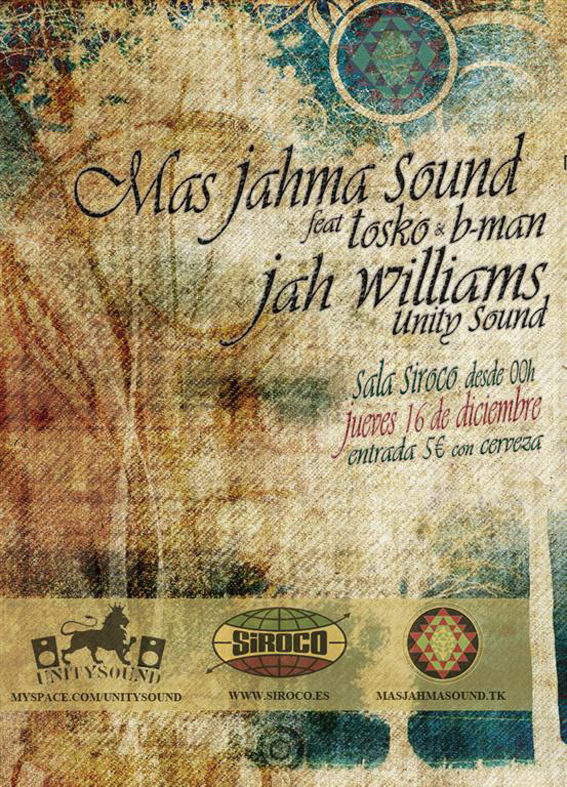 «El próximo Jueves 16 de Diciembre en la Sala Sirico de Madrid podremos disfrutar de una noche repleta de buenas vibraciones con dos de los sound systems más veteranos de la ciudad. Mas Jahma Sound y Jah Williams (Unity Sound) que se encargarán de realizar una selección con las mejores producciones de este ultimo año.»