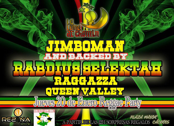 «El jueves 20 de Enero La Luna del Chomin presenta su fiesta y Dancehall, en esta ocasión contaremos con un selektor que desde sus principios apoya a los cantantes, desde Madrid acompañado de Raggazza, Queen Valley y Jimboman