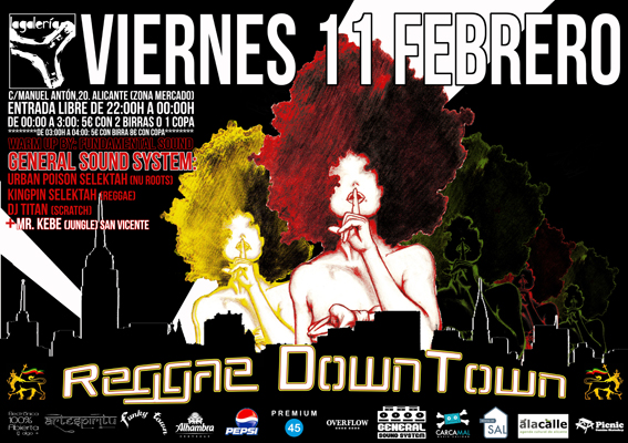 «Ya está aquí la segunda edición de la fiesta Reggae Down Town. Si te gustan el Reggae, Ragga, Nu Roots, Scratch, Jungle,… no te puedes perder está noche en la que contaremos con (Urban Poison Selektah, Kingpin Selektah y Dj Titan).»