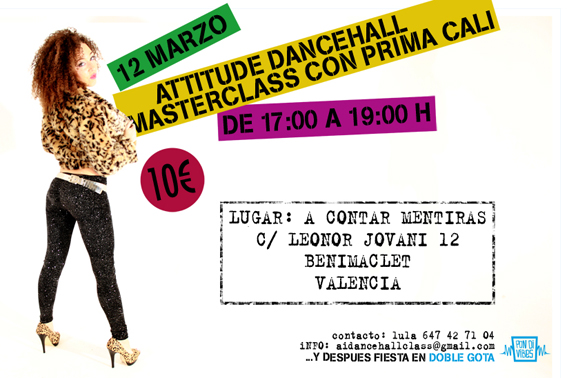 «Te invitamos a la 1º Attitude Master Dancehall Class que se celebra en Valencia, y para ello traemos a Prima Cali dancehall queen , profesora de innumerables clases de dancehall por toda España y extranjero, nos representó en Italia en el European DHQ Contest ’08, y ha bailado con artistas como Tony Matterhorn, Swan Fyahbwoy, Morodo,… y con los mejores sound systems del país ( y con los que vienen de fuera también)… en fin, gran currículum…»