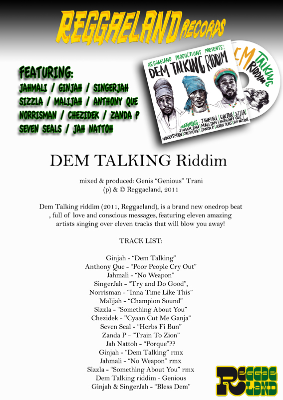 El sello barcelonés Reggaeland presenta Dem Talking Riddim. Cuenta con artistas como Sizzla, , Ginjah o Chezidek entre otros.