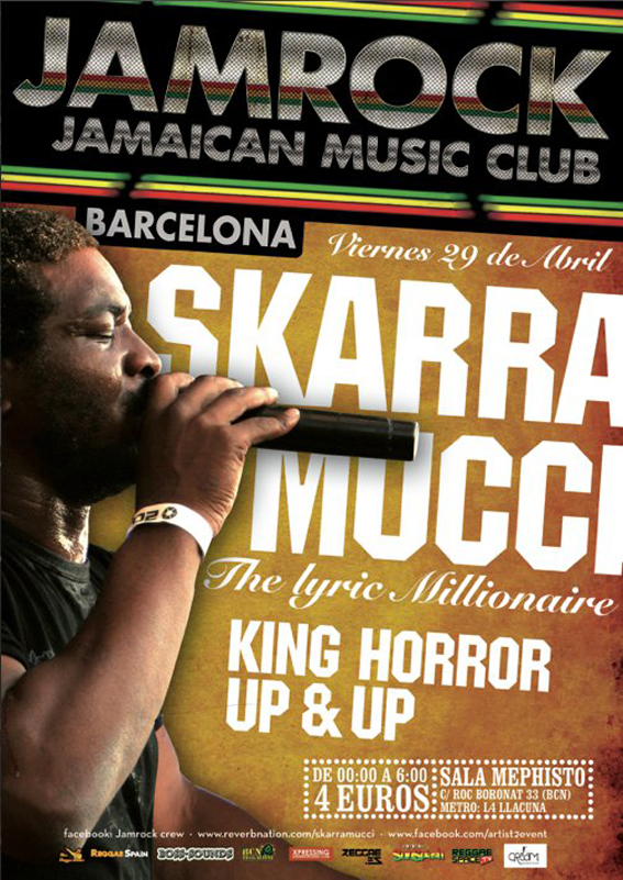 «Skarra Mucci es un artista jamaicano afincado en Europa conocido y aclamado como el artista de dancehall más caliente y dinámico en vivo de Europa. Su estilo es versátil con cambios constantes entre el soul, gospel, rap reggae-dancehall y R&B lo que le convierte en un artista único con un gran don de interminable lírica.»
