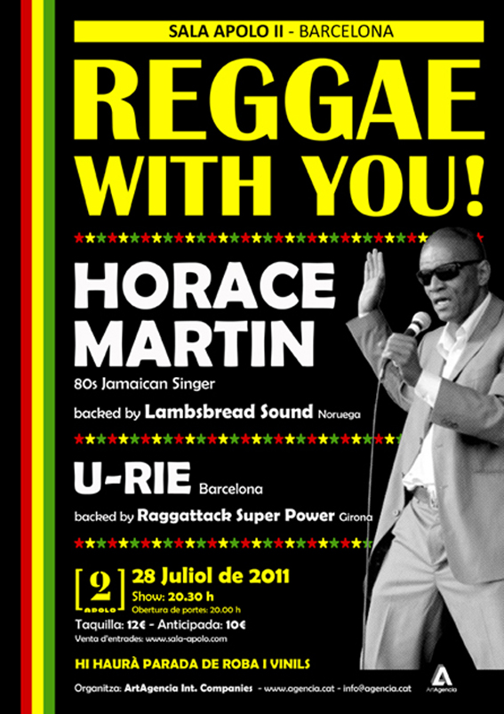 «Os comunico que el próximo 28 de Julio celebramos el Reggae with You! En esta ocasión contamos con la actuación de Horace Martin (80’s jamaican siger) backed by Lambsbread Sound (Nw), U-Rie, cantante catalán con un estilo personal influenciado por los sonidos de la Jamaica de los 80 y líricas conscientes, necesarias en estos tiempos, backed by Raggattack