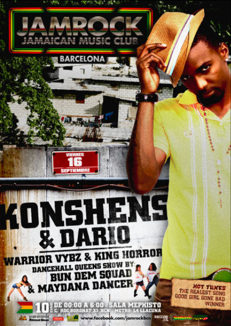 «Se acaba el verano pero vuelve el fuego del Jamrock. Después de una temporada de descanso, recobrando energía y planeando nuevas sesiones, presentan su Jamrock Opening Party. Para la presentación, contarán con el artista jamaicano Konshens acompañado por Dario. Junto a ellos estarán Warrior Vybz y King Horror a los platos para poner a todo el mundo a tono.Y no podía faltar en la inauguración del Jamrock la participación de las mejores Queens de Barcelona, BunDem Squad junto a Maydana Dancer.»