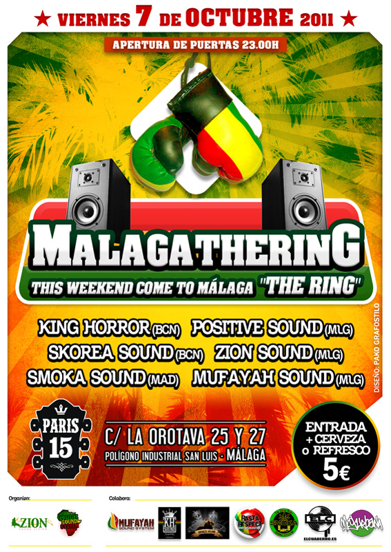 «Por ello Zion Sound y Positive Sound os presentan una fiesta para el viernes 7 a la altura de las circunstancias… Malaga The Ring. Un encuentro amistoso de Sound Systems de la Costa del Sol y de las ciudades a competir en el clash.»
