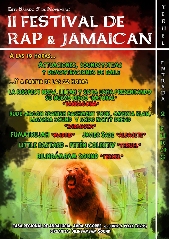 «Este sábado 5 de Noviembre Bilinbámbam presenta, en la Casa Regional de Andalucía de Teruel, el segundo festival Rap & Jamaican con Rude Wagon, Omerta Klan, Lagarra Sound, Godo Dread, La Risspect Krew, Fumatrujah, Javier Sabe, Little Bastard y el anfitrión Bilinbámbam Sound