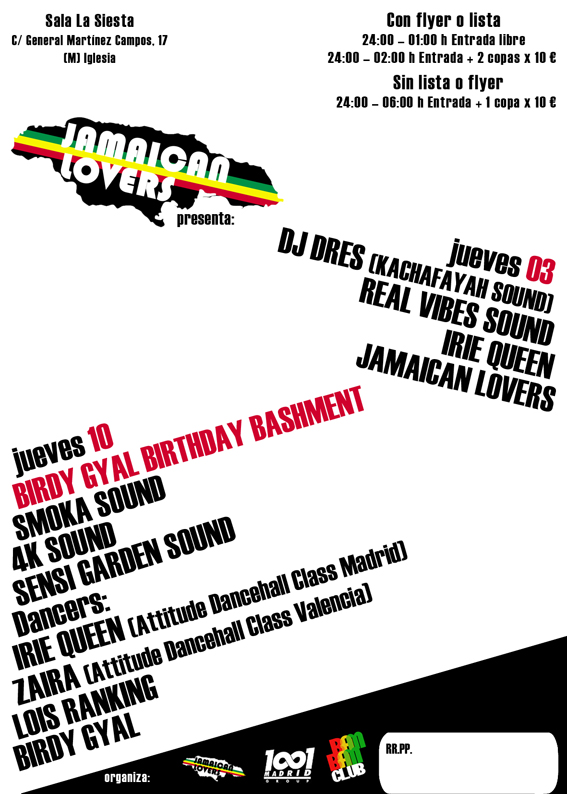 Jueves 10 de Noviembre: Birdy Gyal birthday bashment! Sensi Garden Sound, Sound, 4k Sound, Jamaican Lovers, Irie Queen Dhq, Zaira Dhq, Lois Ranking Dhq y Birdy Gyal Dhq.