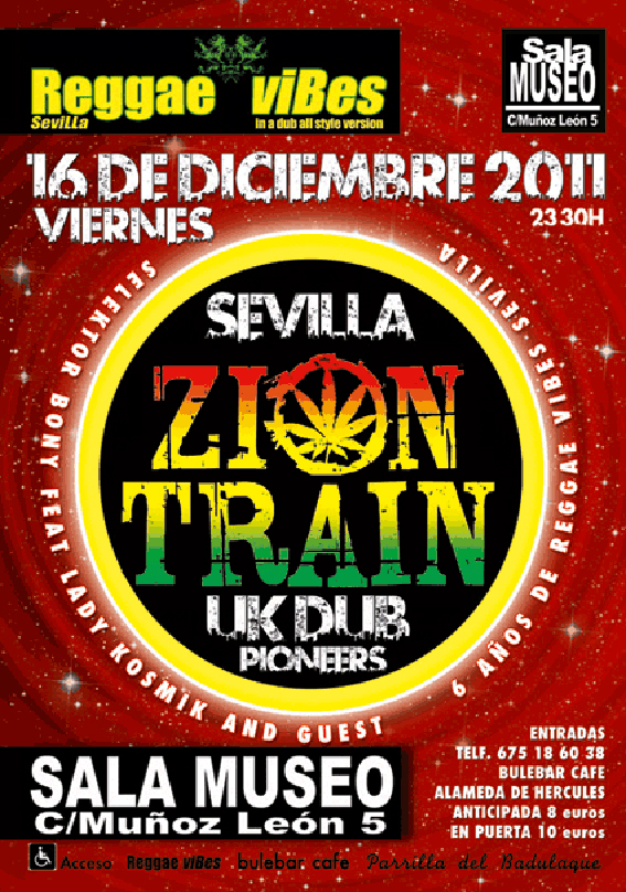 «Reggae Vibes Sevilla, tiene el placer de celebrar sus 6 años junto con Zion Train , que por primera vez actúan en la capital andaluza al completo: Neil Perch (The dub master), Dubdadda (vocals) I say Zion you say Train, Richard Doswell (saxo) quien ha grabado con diferentes estrellas del reggae y el legendario trompetista Dave Fullwood, que hace algunos años a vivió en Sevilla, de la cual tiene gratos recuerdos.»