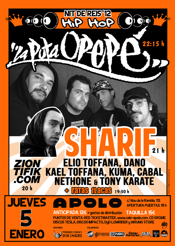 «Algunos de los artistas más destacados del panorama hip hop, se darán cita el próximo jueves 5 de Enero en una nueva edición del concierto Nit de Reis’12 que se celebrará en la sala Apolo de Barcelona.»