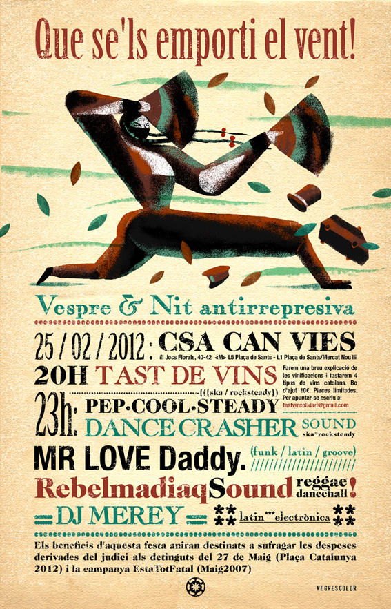 Este sábado 25 de Febrero, a partir de las 23:00, sesión solidaria para sufragar los gastos derivados de los juicios a los detenidos del 27 de Mayo (Plaça Catalunya 2012) y la campaña Estatotfatal.net (Mayo 2007) a cargo de Pep Cool Steady (ska / rocksteady), Dance Crasher Sound (ska / rocksteady), Mr Love Daddy (funk / latin / groove), (reggae / dancehall) y Dj Merey (latin / electrónica) en el CSA Can Vies, III Jocs Florals 40-42, Barcelona.