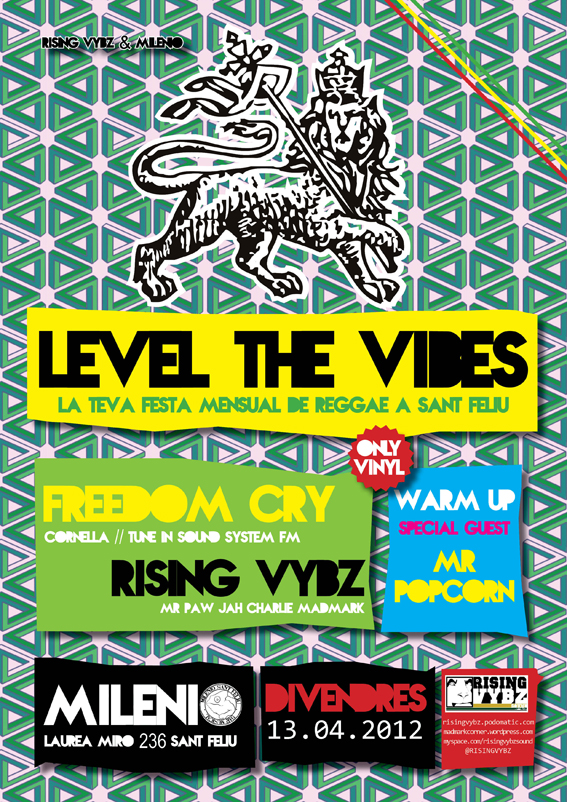 Level the Vibes, fiesta mensual de Reggae en Sant Feliu. Este viernes 13 de Abril sesión a cargo de Rising Vybz y Freedom Cry. Warm up con Mr. Popcorn.