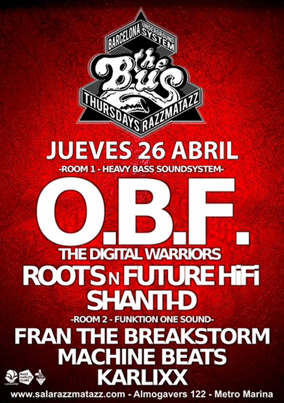 «El próximo jueves 26 de Abril tenemos una noche llena de bajos para todos los gustos:l os guerreros del bass O.B.F. con su Sound System de 20Kws junto a Shanti-D y como invitado especial el bateria de High Tone en su proyecto en solitario Roots Future Hifi. Y en la sala 2 nuestros ya conocidos Fran The Breakstorm, Karlixx y Machine Beats con sus maletas llenas de dubstep, dnb y raggajungle. Are you ready for the Bassline?»