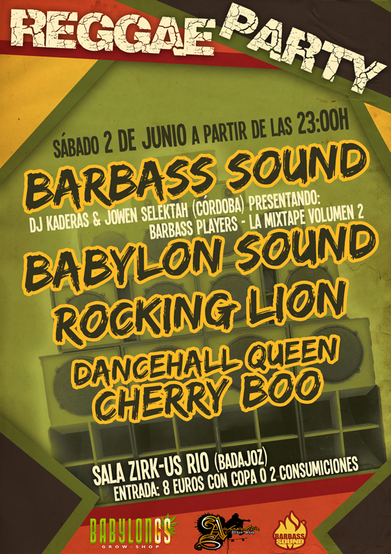 «Reggae party en Badajoz el día 2 de Junio en sala Zirkus apartir de las 23:00 con Barbass Sound (Dj Kaderas y Jowen selektah), Babylon Sound, Rockinkg Lion y Dancehall Queen Cherry Boo.»
