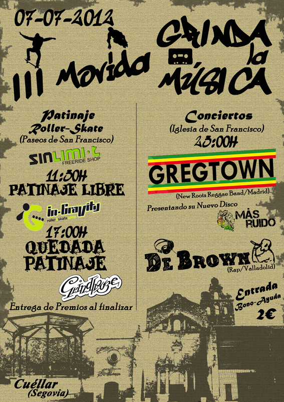 «Como en años anteriores a partir de las 23:00 comenzarán una serie de conciertos en la Iglesia de San Francisco, en esta ocasión tendrán una entrada en condición de bono-ayuda para el evento de 2€. Este año se contará con la participación del grupo de rap vallisoletano De Brown, el cual traerá a la localidad su música llena de la más pura esencia de la cultura Hip Hop, de la mano de sus Mcs, Bras y Negro. Como plato fuerte de esta edición contaremos con la banda madrileña de New Reggae en castellano, Gregtown. Esta banda consiguió en 2010 ser la ganadora del Spanish Reggae Contest Rototom, en la actualidad cuenta con dos discos editados, 12 Golpes (2010) y Más Ruido (2012) y viene a Cuéllar presentando este último. La banda cuenta con miembros de bandas como Mad Sensi Band o Emeterians en sus filas, además han actuado en gran variedad de escenarios pasando por festivales como, el Campeonato del Mundo de Surf Zarautz en 2010, Viñarock 2011 o también en 2011. En la gira de su anterior disco compartieron escenario entre otros con Julian Marley, Israel Vibration, Dub Inc., Emeterians, Mad Sensi Band, Swan Fyahbwoy, Capleton…»