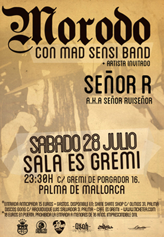 Sábado 28 de Julio actuación de Morodo acompañado por Mad Sensi Band en la sala Es Gremi de Mallorca. Completará el cartel Señor R aka Señor Ruiseñor.