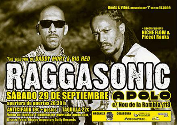 Raggasonic, la formación pionera de reggae francés, compuesta por Big y , vuelven a reunirse. Vendrán por primera vez a España a presentar su nuevo trabajo Raggasonic 3, en una única fecha que será en Barcelona, en la Sala Apolo el 29 de Septiembre, Sábado. La noche contará con la actuación los invitados especiales Niche Flow & Piccot Ranks.”
