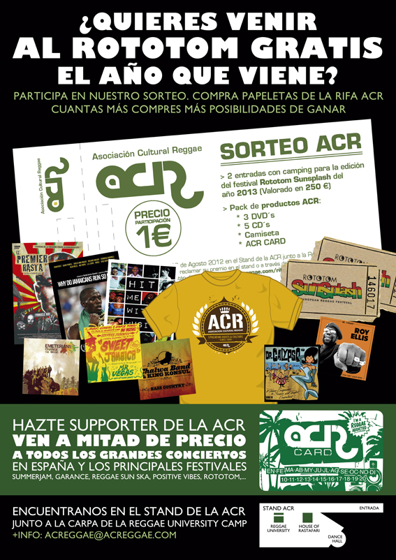 Además, la ACR dispondrá, al igual que en ediciones anteriores, de su propio stand. Situado junto a la Reggae University, será el espacio donde informaremos de todos nuestros proyectos. No dudes en visitarnos, hacerte con tu ACR Card o adquirir algunos de los productos que tendremos a la venta.