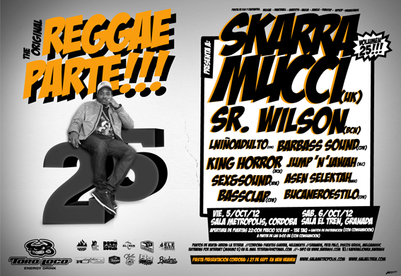 «Ya son 25 ediciones de reggaeparte las que llevamos desde el 2004 y por ello hemos preparado una buena fiesta para celebarlo, con un cartel que combina un artista internacional Skarra Mucci, lo mejor del reggae estatal con Sr. Wilson, Jump´N´Jawah y King Horror y como no, lo más cercano, con los sounds y cantantes andaluces Lniño Adulto desde Bujalance, y Asen Selektah desde Ubeda y Jaen, y los cordobeses Bucaneroestilo, Bassclap y con y Dj Kaderas