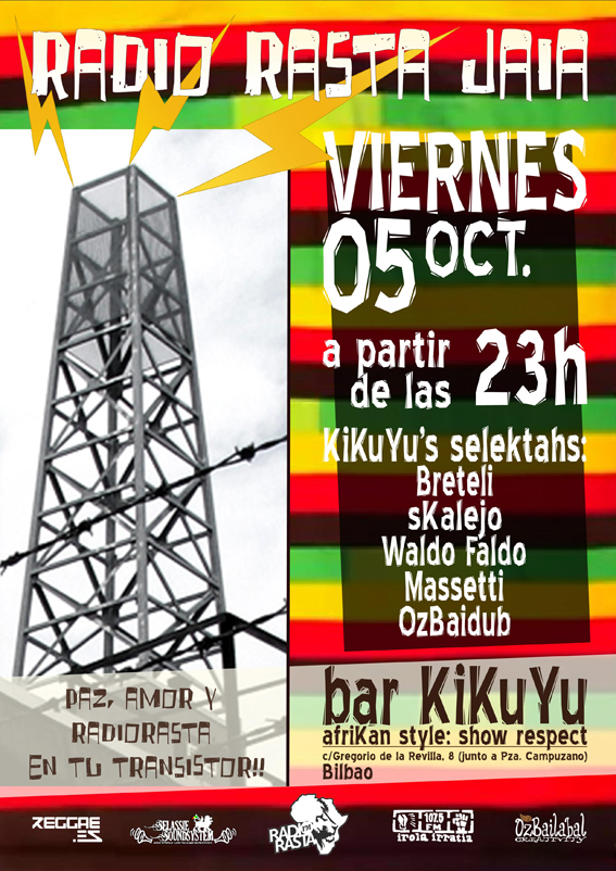 «Este próximo viernes 5 de Octubre, la familia de Radio Rasta celebra la llegada del Otoño con una fiesta por todo lo alto en el café-bar Kikuyu, en pleno corazón de Bilbao (C/ Gregorio de la Revilla) y con todos los selektores de música habituales del garito.»