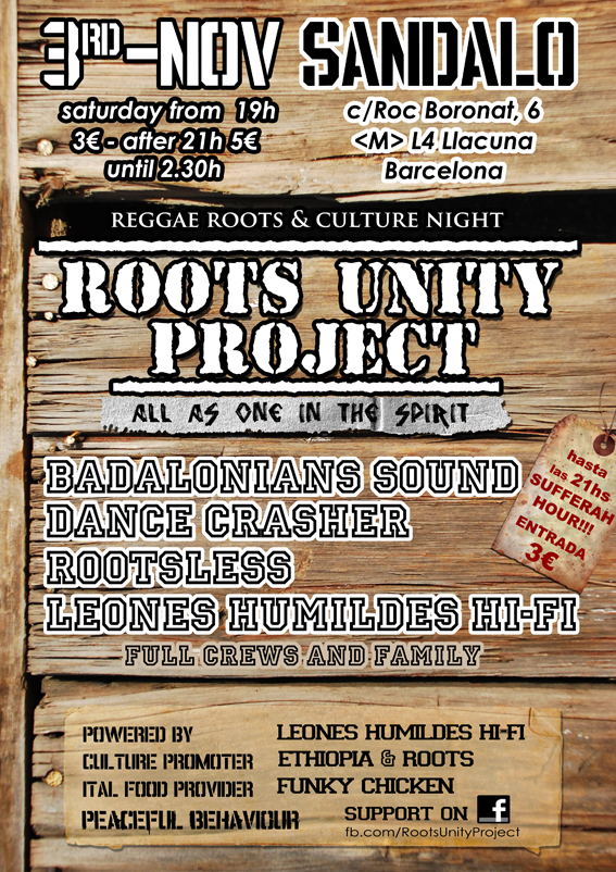 El sábado 3 de Noviembre se celebrará la segunda edicción del Roots Unity Project en la sala Sandalo de Barcelona.
