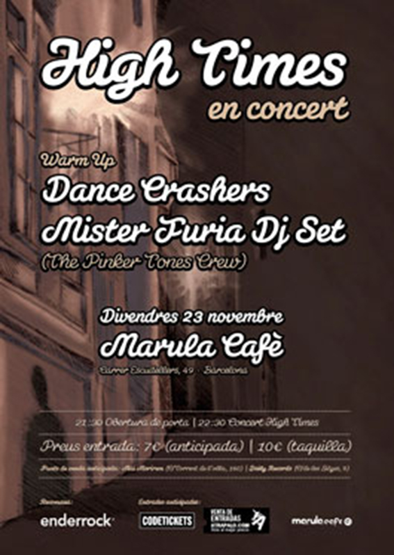 «High Times es una banda de ska de Barcelona, que en 2008 registraron un EP grabado por Marc Tena y Jordi Manyà (Skatalà, Dr. Calypso, The Fenicians). Desde entonces, la banda no ha dejado de dar conciertos con un potente repertorio combinado de temas en catalán e inglés con influencias claramente jamaicanas.»