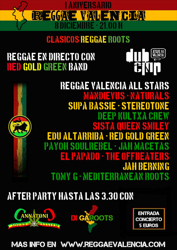 «El concierto será a cargo de la banda valenciana Red Gold & Green Band, que nos ofrecerá un directo de casi dos horas con clasicos del Reggae (Bob Marley, Dennis Brown, The Gladiators, Marcia Griffiths, etc) cantados por un all stars valenciano y que promete ser un concierto antologico. A las voces participaran: Tomy G (Mediterranean Roots), El Papado (The Offbeaters), Payoh SoulRebel (Jah Macetas), Sista Queen Smiley, Deep Kultxa Crew con Don Fito, Paula Bam Bam e Ital Erik (Ki Sap), Jah Berning (ex-Jah Macetas), Edu Altarriba (Red Gold & Green Band), Supa Bassie (Stereotone) y Mandievus (Naturals).»