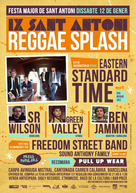 «Llega una nueva edición del Sant Antoni Reggae Splash, uno de los festivales de música jamaicana más conocidos de Barcelona y que este año contará de nuevo con algunos de los mejores artistas del género. Desde Estados Unidos nos visitará el grupo de ska-jazz y reggae Eastern Standard Time, desde Vitoria el cantante de reggae Green Valley, y de Barcelona tendremos a la rebelación del reggae español Sr Wilson y a una de las mejores voces del género: Benjammin, los tres acompañados por la banda catalana Freedom Street Band. Abrirá el el colectivo Sound Anthony Family