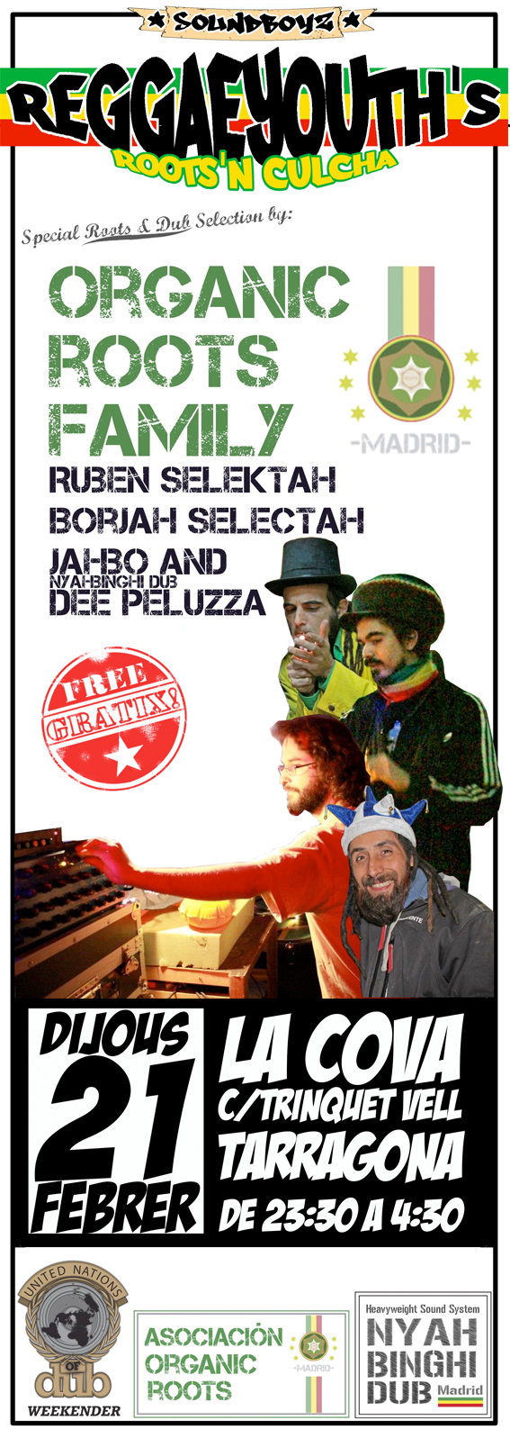 El jueves 21 de Febrero vuelven las fiestas de Reggaeyouth’s a Tarragona para traer artistas de otras tierras. Esta vez, un especial roots & culcha de la mano de Organic Roots Family desde Madrid con Ruben Selectah, Borjah Selectah y Jahbo & Dee Peluzza de Nyahbinghi Dub.