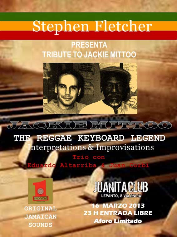 El 16 de Marzo en el mítico Juanita Club, C/Lepanto 8 de Valencia, el teclista y compositor hará un tributo al gran Jackie Mittoo. Mittoo es una piedra angular en la música jamaicana, para cualquiera que tenga un mínimo de conocimiento de causa, eso es indudable, pero poco habitual es su reconocimiento público, al menos por estas tierras.