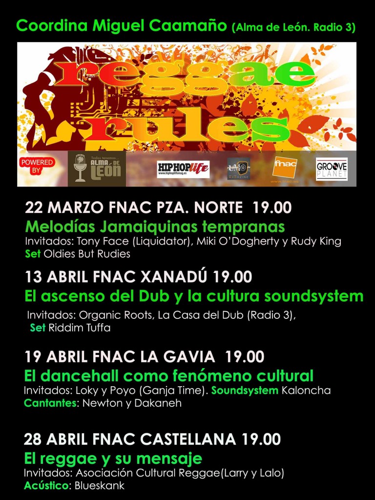 Solo queda ya un par de días para disfrutar el primer Reggae Rules, el ciclo que coordina el periodista Miguel Caamaño y que tendrá lugar en cuatro tiendas Fnac de Madrid a partir del próximo viernes 22. El proyecto pretende acercar la cultura reggae y profundizar en las raíces y desarrollo de la misma a lo largo de la historia, especialmente en España. Caamaño ha estructurado el concepto en cuatro eventos que contemplan todos los aspectos de la cultura que desde Jamaica, ha influido poderosamente en la música contemporánea. Las raíces, los diferentes estilos y su progresión histórica y la repercusión definitiva en la cultura reciente de nuestro país.