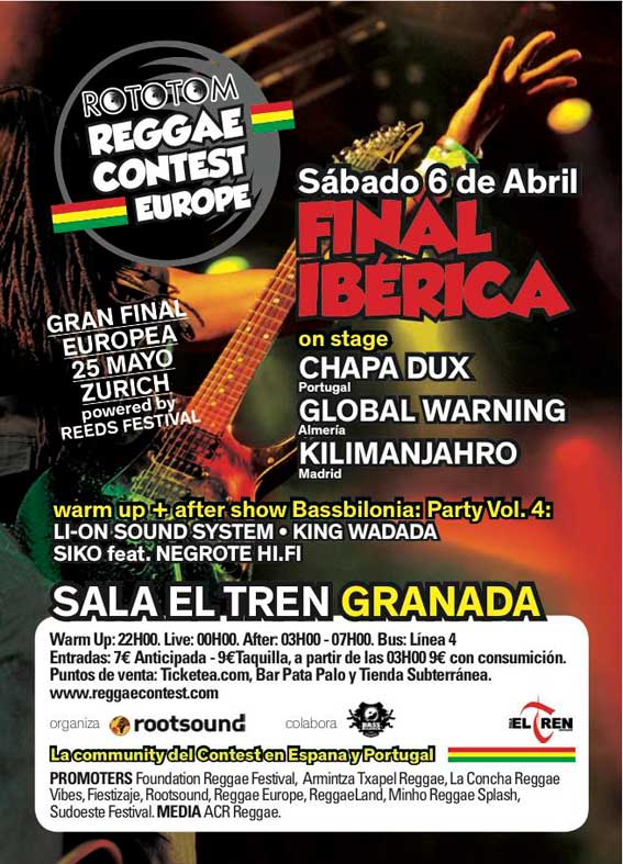 Granada acogerá la final ibérica del concurso de nuevas bandas del Rototom Sunsplash, el European Reggae Contest, que este año llega a la undécima edición con más de 250 participantes de 30 países europeos. Los portugueses Chapa Dux, los madrileños Kilimanjahro y los almerienses Global Warning actuarán el sábado 6 de abril a las 22.00 en la Sala El Tren para hacerse un hueco en la final europea, que se celebrará el 25 de mayo en Zurich. El premio del ganador final será entrar en el cartel del festival reggae más importante del mundo en su 20ª aniversario, el Rototom Sunsplash, y también en algunos de los más releveantes del continente, como el Sudoeste de Portugal, el Summerjam alemán o el Reggae SunSka francés.