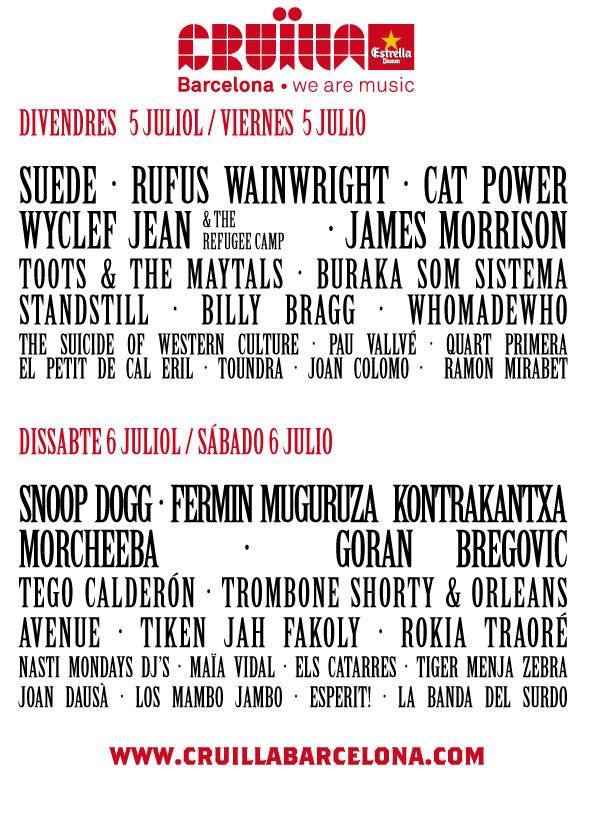 Tiken Jah Fakoli, Wyclef Jean & The Refugee Camp, Buraka Som Sistema, Fermin Muguruza y el controvertido Snoop Dogg ( no sabemos si vendrá representando su polémico alter ego rastafari «Snoop Lion«) y muchos más son la apuesta de un festival ya consolidado que abarca no solo el reggae sino todo tipo de géneros musicales, completan el cartel artistas como Rufus Wainwright, Cat power o Suede entre muchos otros (incluida una selección de músicos catalanes). Dos días de festival intensos en lo musical y que tendrán lugar el viernes 5 y el sábado 6 de Julio. Hay variaos abonos, dos días por 65 €+ gastos de gestión o un día por 40€ + gastos de gestión y abonos nocturnos (podrías entrar de 1:30 a 5 de la madrugada) por sólo 20 € cada día. En el parçc del Fòrum de Barcelona