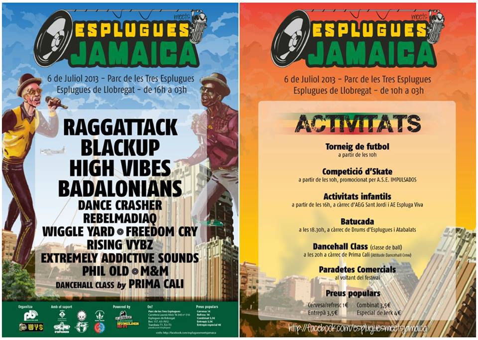 espluguesEste viernes día 6 se celebra el minifestival Esplugues Jamaica en el Parc de les tres esplugues (Esplugues de Llobregat) con montones de actividades y de actuaciones musicales, el evento durará todo el día desde las 1 de la mañana con un torneo de fútbol, torneo de Skate, Batucada, Masterclass de Dancehall impartida por Prima Cali, acompañado de Paradas y precios populares (bocadillos, refrescos y cerveza).