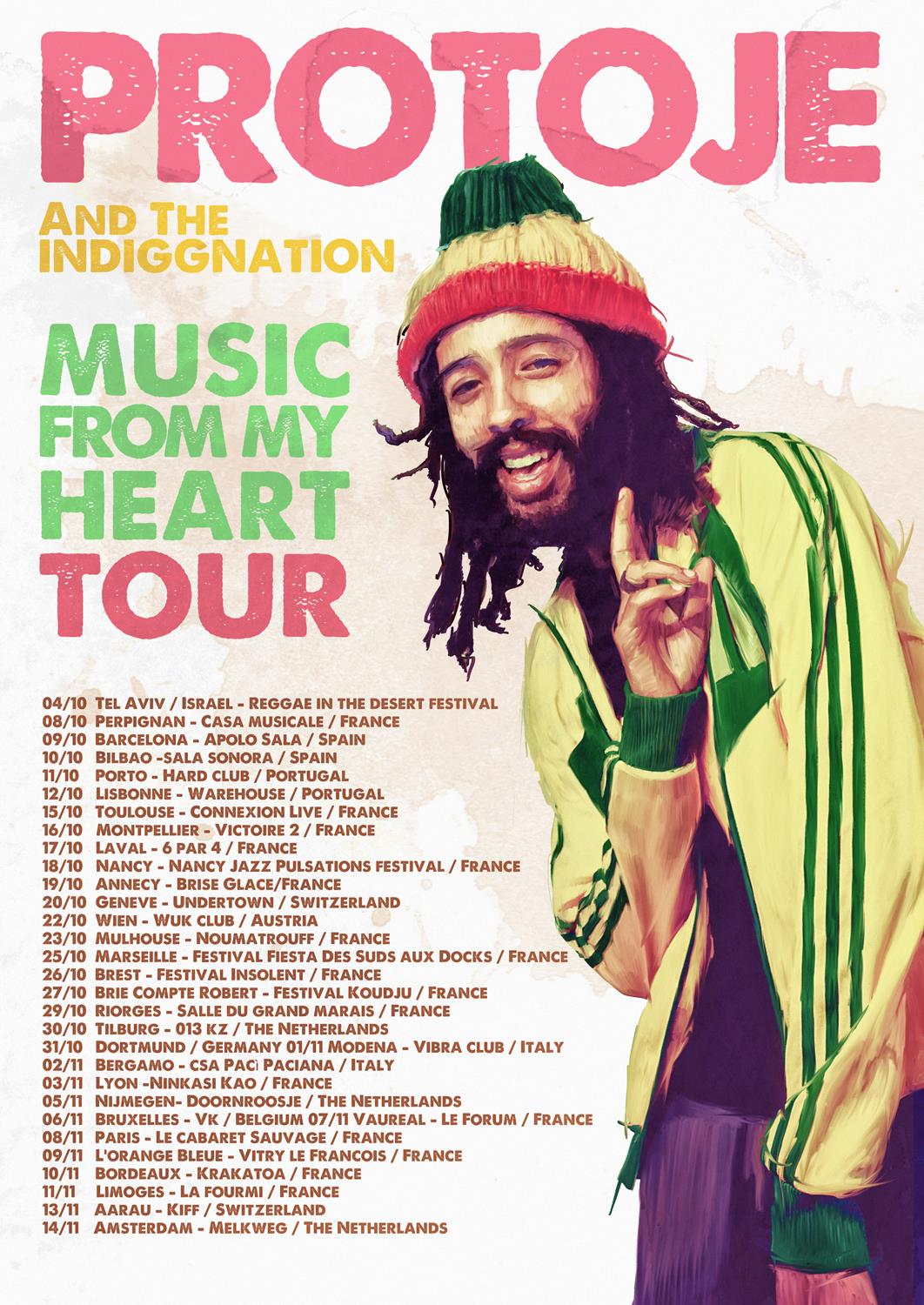Protoje comienza ahora en octubre su tour Europeo. La primera fecha es Tel Aviv y cerrará en Amsterdam a mediados de Noviembre. Esta gira incluye varias fechas en España. la Apolo de Barcelona (9 de Octubre), Sala Sonora de Bilbao ( 10 de Octubre), y Erandio (por definir). No hay más fechas en nuestro país cerradas, en cualquier caso detallaremos toda la información en breve.