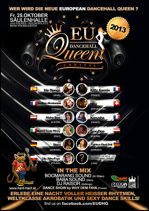 El 25 de Octubre se celebrará en Austria el «European Dancehall Queen Contest» y España se verá repersentada por Irie Queen, miembro del grupo Attitude Dancehall Crew y custodia de la corona de Queen española a dia de hoy. En esta edición, estan llevando a cabo una promoción personal de cada artista a través de las redes sociales, implicando a toda la massive que no puedan estar alli para que den su apoyo a sus candidatas desde la lejanía. Así, desde el Facebook oficial del contest, han habilitado una votación y la dancer que más votos obtenga y más repercusión tenga a travésde las redes obtendrá un punto extra del jurado para alzar la corona europea.